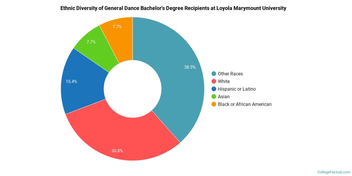 During the 2020-2021 academic year, Loyola Marymount University handed out 13 bachelor's degrees in general dance. This is a decrease of 13% over the previous year when 15 degrees were handed out.