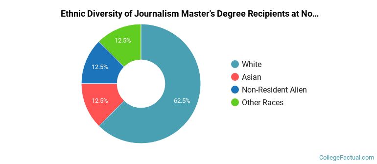During the 2021-2022 academic year, 16 journalism majors earned their master's degree from Northeastern. Of these graduates, 50% were men and 50% were women.