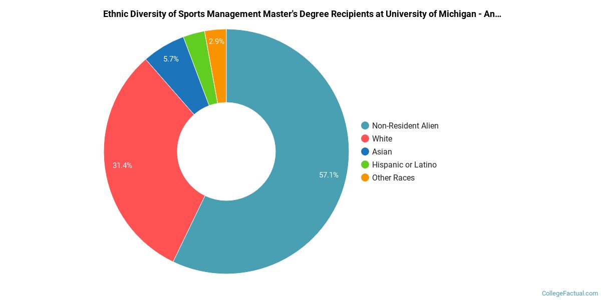 In 2021, 35 students received their master’s degree in sports management from U-M. This makes it the #31 most popular school for sports management master’s degree candidates in the country.