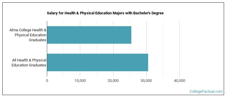 Phys Ed majors who earn their bachelor's degree from Alma go on to jobs where they make a median salary of $25,445 a year. This is less than $30,571, which is the national median of all phys ed majors in the nation who earn bachelor's degrees.