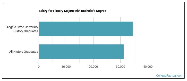 The median salary of history students who receive their bachelor's degree at Angelo State is $34,519. This is great news for graduates of the program, since this figure is higher than the national average of $31,217 for all history bachelor's degree recipients.