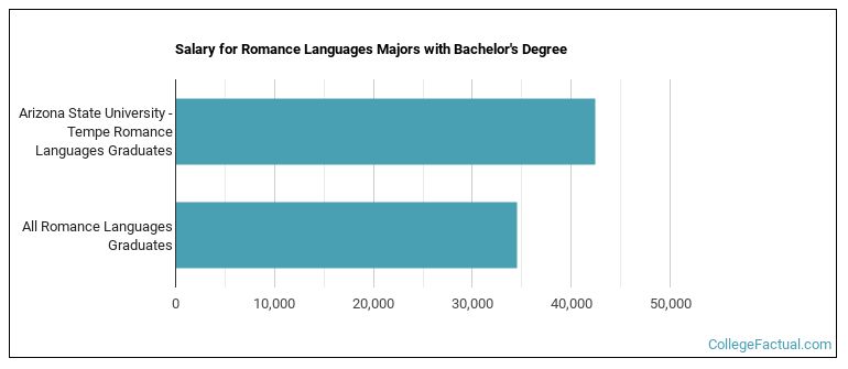 The median salary of romance languages students who receive their bachelor's degree at ASU - Tempe is $42,436. This is higher than $34,510, which is the national median for all romance languages bachelor's degree recipients.