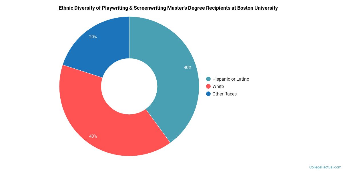 Of the 5 students who graduated with a Master’s in playwriting and screenwriting from Boston U in 2021, 20% were men and 80% were women.