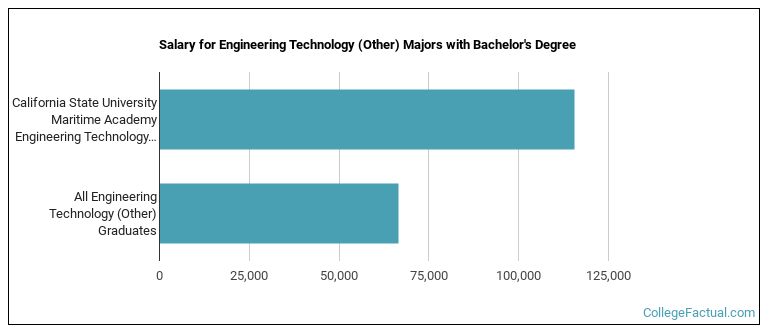 The median salary of other engineering tech students who receive their bachelor's degree at Cal Maritime is $115,589. This is higher than $66,626, which is the national median for all other engineering tech bachelor's degree recipients.