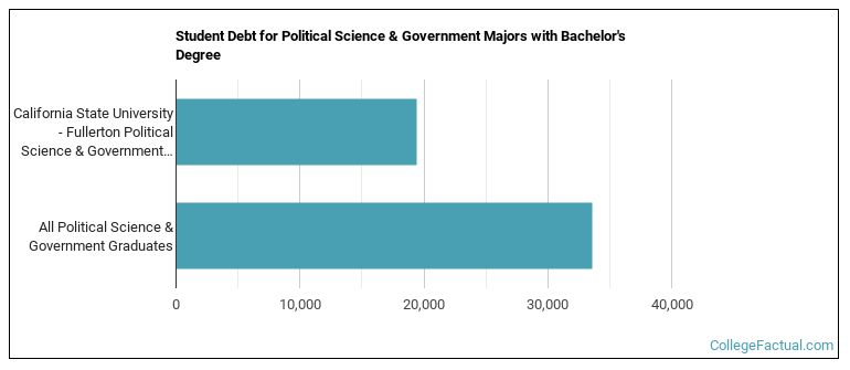 While getting their bachelor's degree at Cal State Fullerton, political science students borrow a median amount of $19,409 in student loans. This is not too bad considering that the median debt load of all political science bachelor's degree recipients across the country is $33,583.