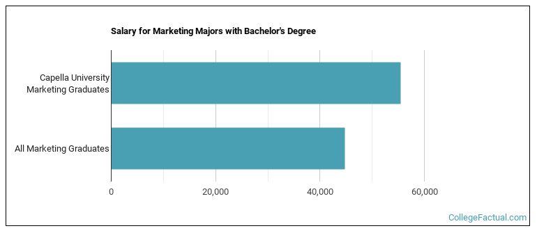 Marketing majors who earn their bachelor's degree from Capella University go on to jobs where they make a median salary of $55,495 a year. This is higher than $44,742, which is the national median for all marketing bachelor's degree recipients.
