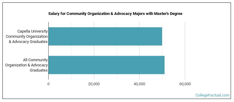 Graduates of the master's community organization program at Capella University make a median salary of $50,009. This is less than what their typical peers from other schools make. Their median salary is $51,055.