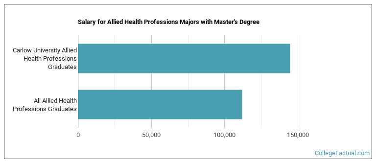 The median salary of allied health students who receive their bachelor's degree at Carlow is $56,834. This is less than $60,597, which is the national median of all allied health majors in the nation who earn bachelor's degrees.