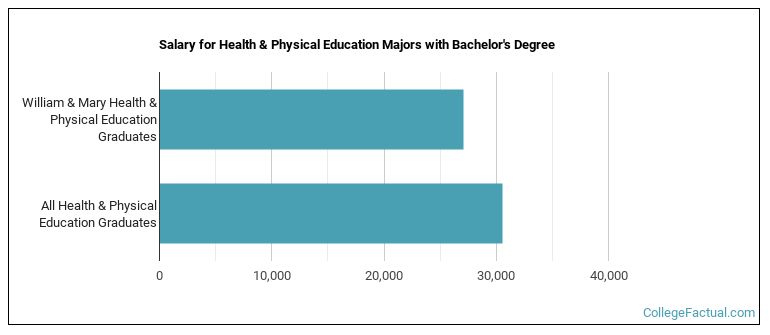 The median salary of phys ed students who receive their bachelor's degree at William & Mary is $27,114. Unfortunately, this is lower than the national average of $30,571 for all phys ed students.