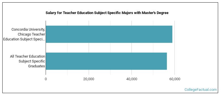 Graduates of the master's subject specific ed program at Concordia University, Chicago make a median salary of $58,990. This is a better than average outcome since the median salary for all subject specific ed graduates with a master's is $56,457.