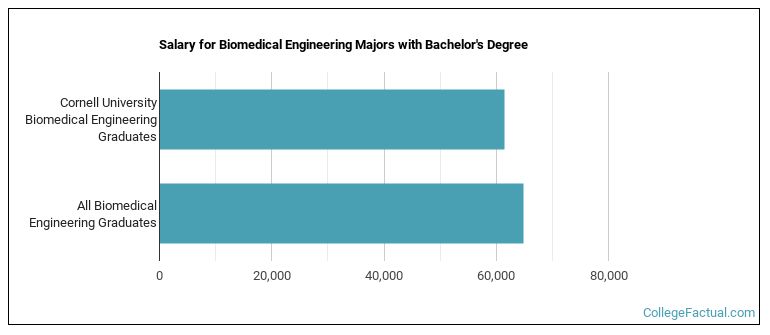 The median salary of bio engineering students who receive their bachelor's degree at Cornell is $61,397. Unfortunately, this is lower than the national average of $64,853 for all bio engineering students.