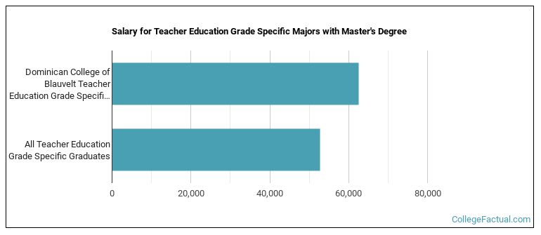 Grade Specific Ed majors graduating with a master's degree from Dominican College make a median salary of $62,461 a year. This is a better than average outcome since the median salary for all grade specific ed graduates with a master's is $52,763.