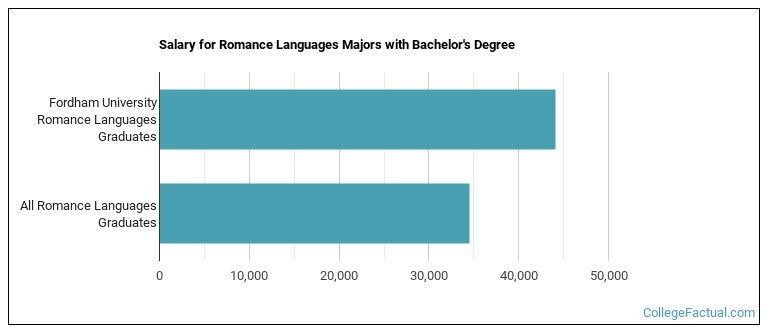 The median salary of romance languages students who receive their bachelor's degree at Fordham U is $44,073. This is higher than $34,510, which is the national median for all romance languages bachelor's degree recipients.