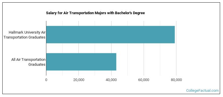 Air Transport majors who earn their bachelor's degree from Hallmark go on to jobs where they make a median salary of $79,086 a year. This is great news for graduates of the program, since this figure is higher than the national average of $43,044 for all air transport bachelor's degree recipients.