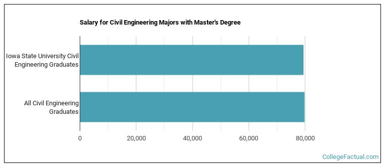 Civil Eng majors graduating with a master's degree from Iowa State make a median salary of $79,509 a year. This is less than what their typical peers from other schools make. Their median salary is $79,898.
