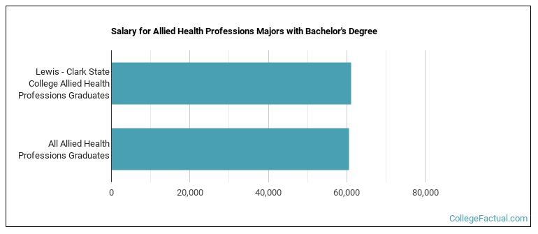The median salary of allied health students who receive their bachelor's degree at Lewis - Clark State College is $61,097. This is higher than $60,597, which is the national median for all allied health bachelor's degree recipients.