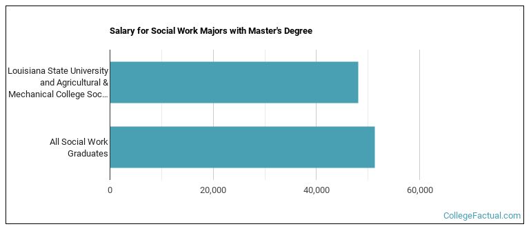 Social Work majors graduating with a master's degree from Louisiana State University make a median salary of $48,116 a year. This is less than what their typical peers from other schools make. Their median salary is $51,347.