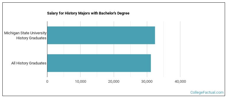 The median salary of history students who receive their bachelor's degree at Michigan State is $32,434. This is higher than $31,217, which is the national median for all history bachelor's degree recipients.