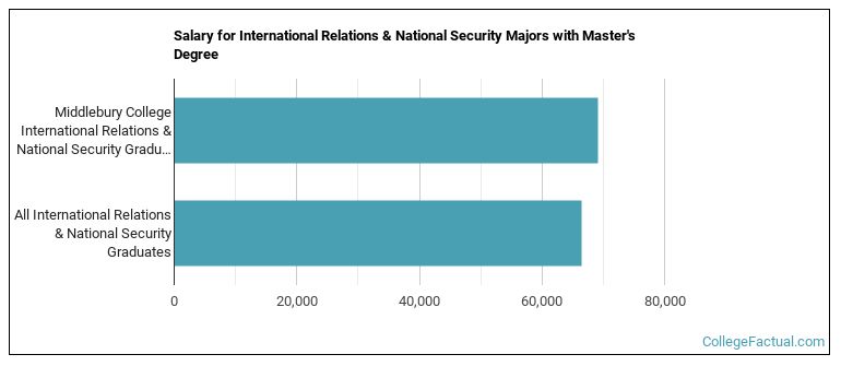 International Relations majors graduating with a master's degree from Middlebury make a median salary of $69,196 a year. This is a better than average outcome since the median salary for all international relations graduates with a master's is $66,511.
