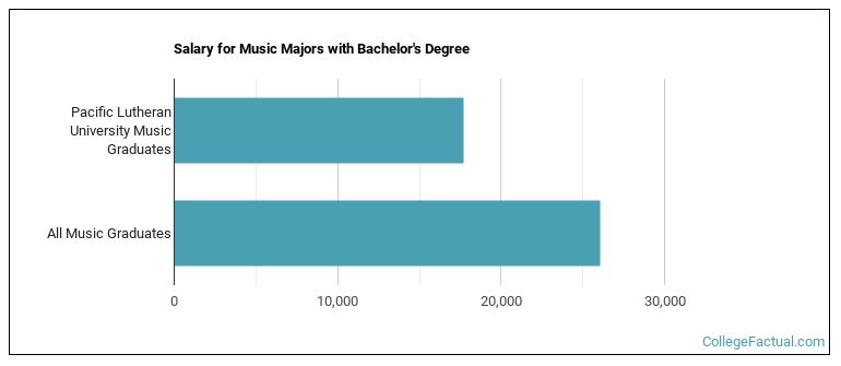 The median salary of music students who receive their bachelor's degree at PLU is $17,711. This is less than $26,036, which is the national median of all music majors in the nation who earn bachelor's degrees.