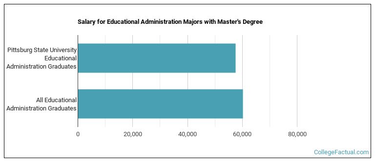 Graduates of the master's education admin program at Pitt State make a median salary of $57,469. This is less than what their typical peers from other schools make. Their median salary is $60,279.