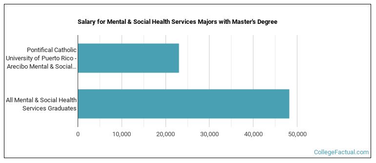 Graduates of the master's mental health services program at Pontifical Catholic University of Puerto Rico - Arecibo make a median salary of $23,018. This is less than what their typical peers from other schools make. Their median salary is $48,197.