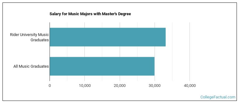 Music majors graduating with a master's degree from Rider make a median salary of $33,158 a year. This is a better than average outcome since the median salary for all music graduates with a master's is $29,974.