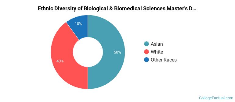 The following table and chart show the ethnic background for students who recently graduated from Roseman University of Health Sciences with a master's in biological & biomedical sciences.