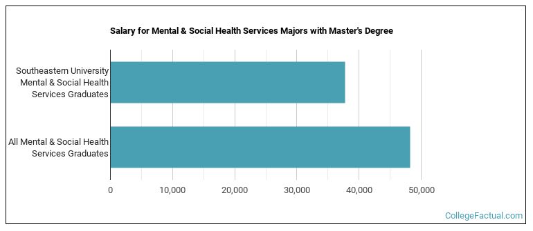 Mental Health Services majors graduating with a master's degree from SEU make a median salary of $37,746 a year. This is less than what their typical peers from other schools make. Their median salary is $48,197.
