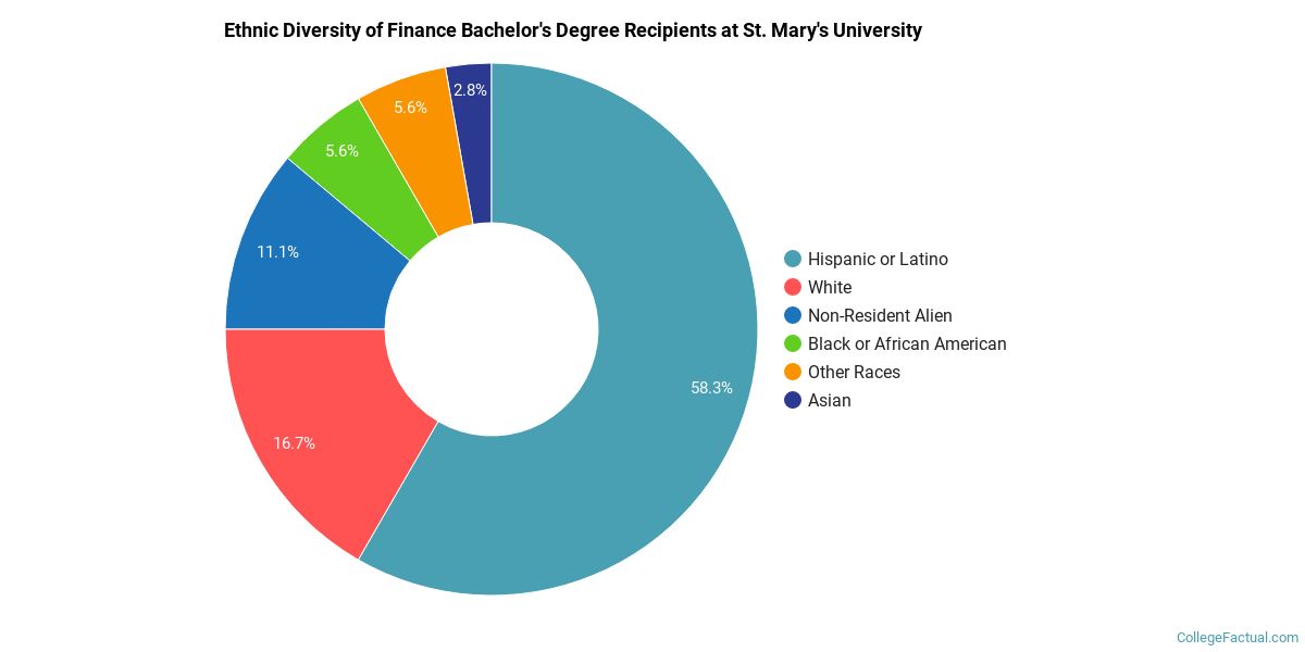 During the 2020-2021 academic year, St. Mary's University handed out 36 bachelor's degrees in finance. This is a decrease of 5% over the previous year when 38 degrees were handed out.