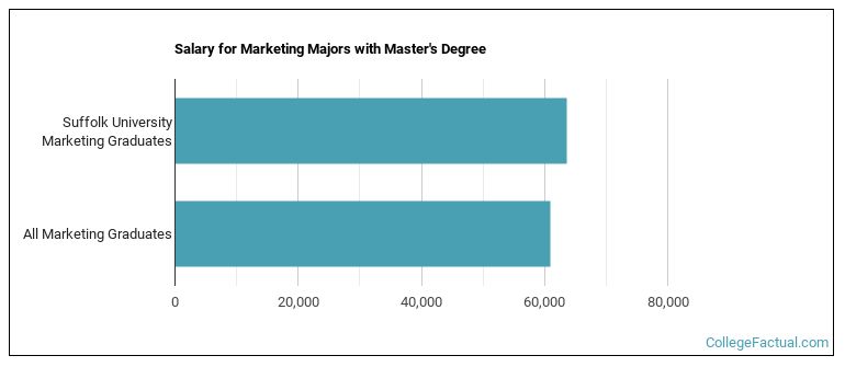 Marketing majors graduating with a master's degree from Suffolk make a median salary of $63,609 a year. This is a better than average outcome since the median salary for all marketing graduates with a master's is $61,017.
