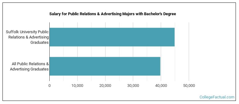 The median salary of public relations students who receive their bachelor's degree at Suffolk is $44,863. This is great news for graduates of the program, since this figure is higher than the national average of $39,794 for all public relations bachelor's degree recipients.