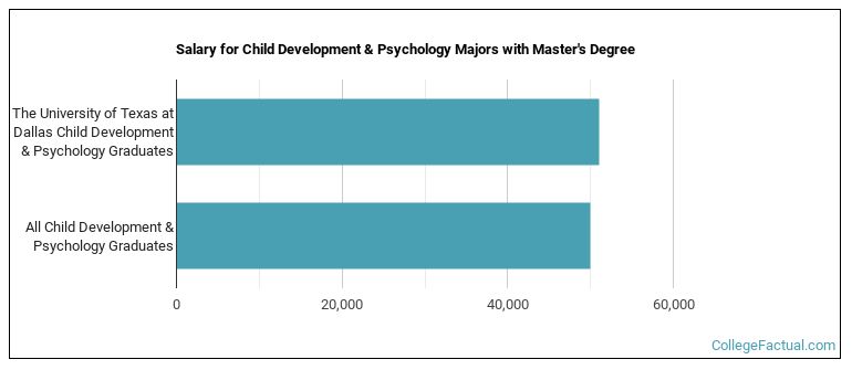 Child Development majors graduating with a master's degree from UT Dallas make a median salary of $51,067 a year. This is a better than average outcome since the median salary for all child development graduates with a master's is $50,014.