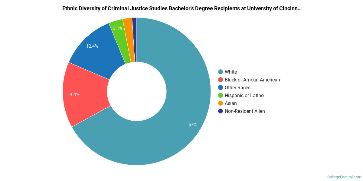 The following table and chart show the ethnic background for students who recently graduated from University of Cincinnati - Main Campus with a bachelor's in criminal justice studies.