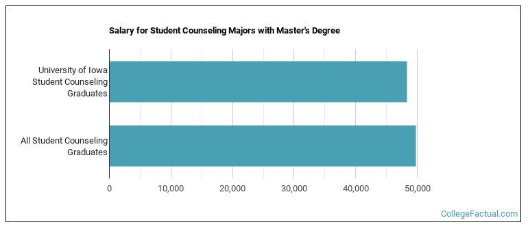 Student Counseling majors graduating with a master's degree from Iowa make a median salary of $48,327 a year. This is less than what their typical peers from other schools make. Their median salary is $49,734.