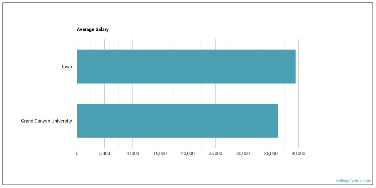 Your early-career salary depends on many things, such as from what school you graduate. Once they get their degree, students from Iowa take jobs where the average salary is $39,491. As a comparison, graduates of Grand Canyon University make, on average, $36,325 during the early years of their career.