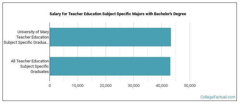 The median salary of subject specific ed students who receive their bachelor's degree at UMary is $43,299. This is higher than $43,086, which is the national median for all subject specific ed bachelor's degree recipients.