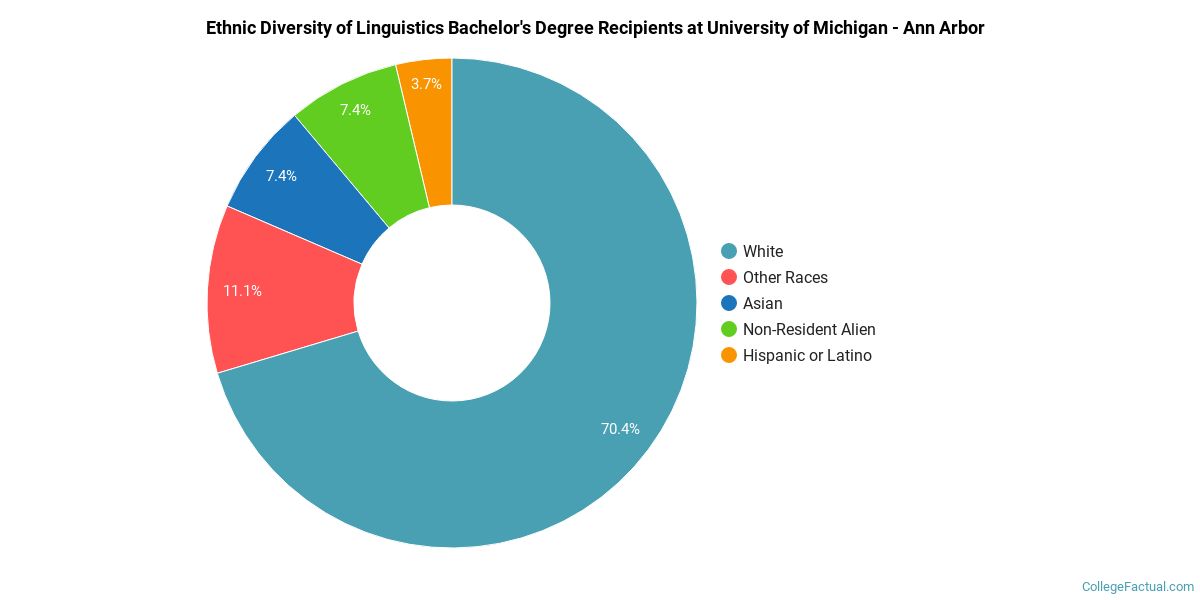 The following table and chart show the ethnic background for students who recently graduated from University of Michigan - Ann Arbor with a bachelor's in linguistics.