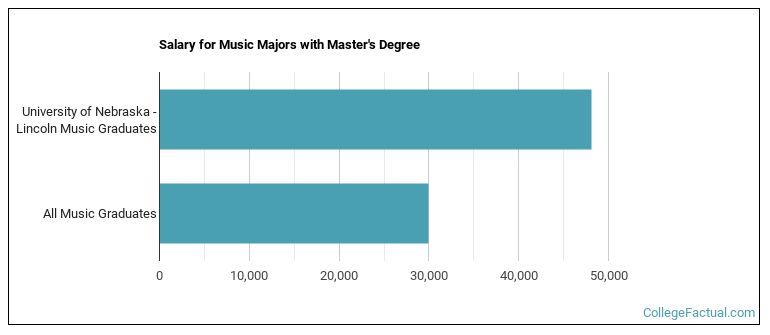 Music majors graduating with a master's degree from UNL make a median salary of $48,098 a year. This is a better than average outcome since the median salary for all music graduates with a master's is $29,974.