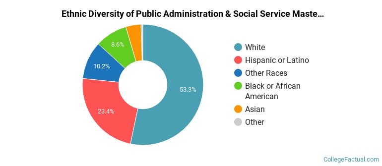 The following table and chart show the ethnic background for students who recently graduated from University of Nevada - Reno with a master's in public administration & social service.