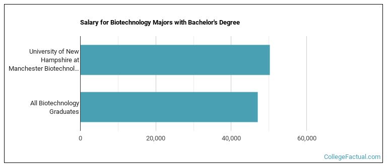 Biotech majors who earn their bachelor's degree from UNH Manchester go on to jobs where they make a median salary of $50,276 a year. This is great news for graduates of the program, since this figure is higher than the national average of $47,017 for all biotech bachelor's degree recipients.