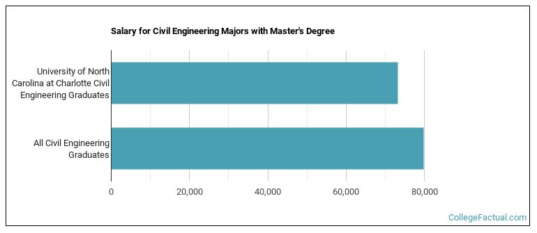 Civil Eng majors graduating with a master's degree from UNC Charlotte make a median salary of $73,145 a year. This is less than what their typical peers from other schools make. Their median salary is $79,898.