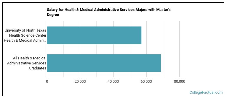 Health & Medical Administrative Services majors graduating with a master's degree from UNT Health Science Center make a median salary of $56,954 a year. This is less than what their typical peers from other schools make. Their median salary is $68,719.