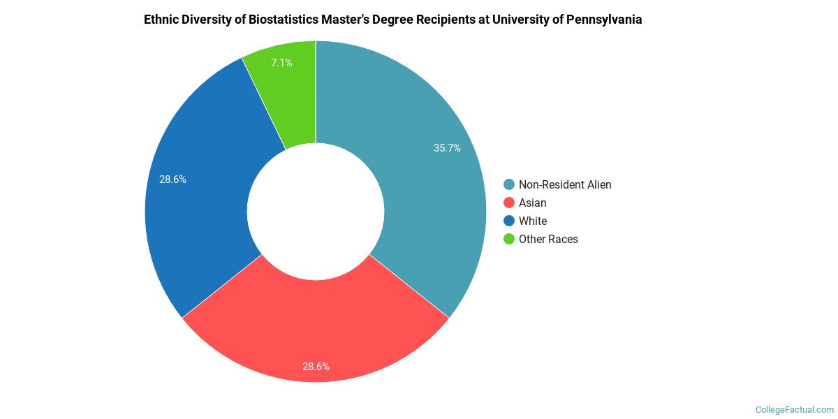 In the 2020-2021 academic year, 14 students earned a master's degree in biostatistics from UPenn. About 64% of these graduates were women and the other 36% were men.