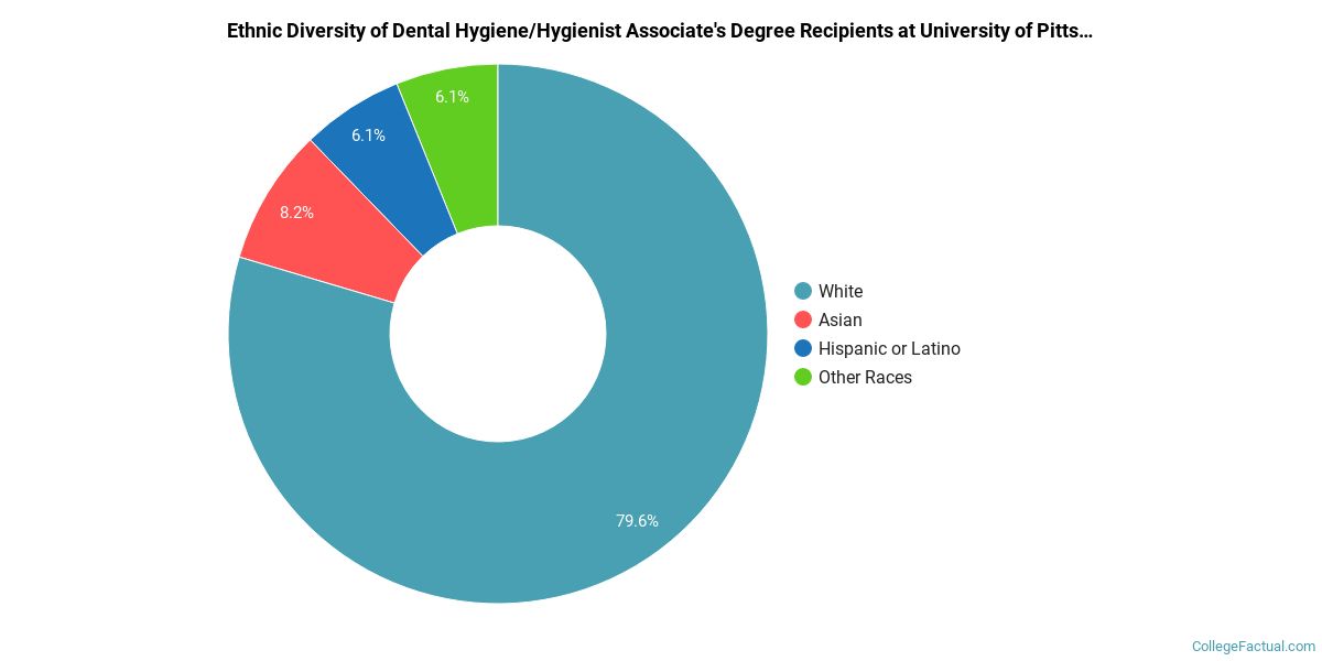 The following table and chart show the ethnic background for students who recently graduated from University of Pittsburgh - Pittsburgh Campus with a bachelor's in dental hygiene.