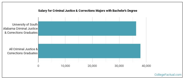The median salary of criminal justice students who receive their bachelor's degree at USA is $36,216. This is less than $37,901, which is the national median of all criminal justice majors in the nation who earn bachelor's degrees.