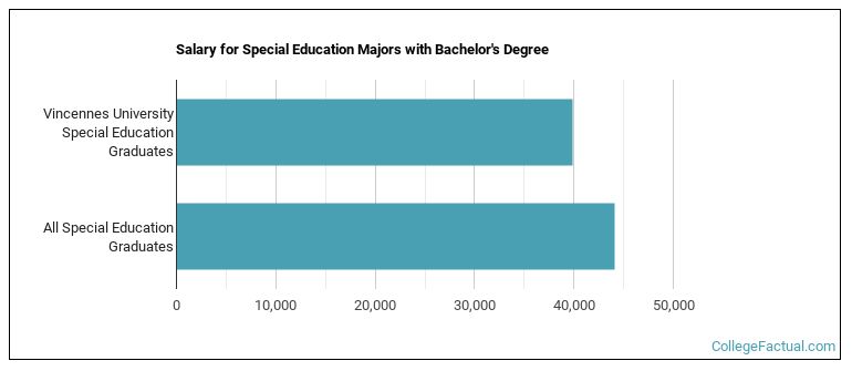 The median salary of special ed students who receive their bachelor's degree at Vincennes University is $39,867. This is less than $44,139, which is the national median of all special ed majors in the nation who earn bachelor's degrees.