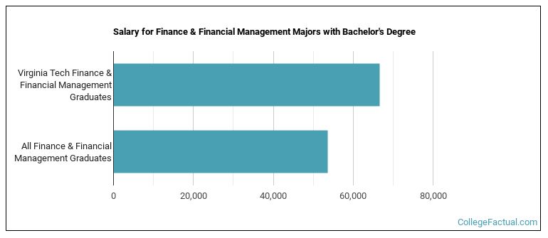 The median salary of finance students who receive their bachelor's degree at Virginia Tech is $66,601. This is higher than $53,649, which is the national median for all finance bachelor's degree recipients.