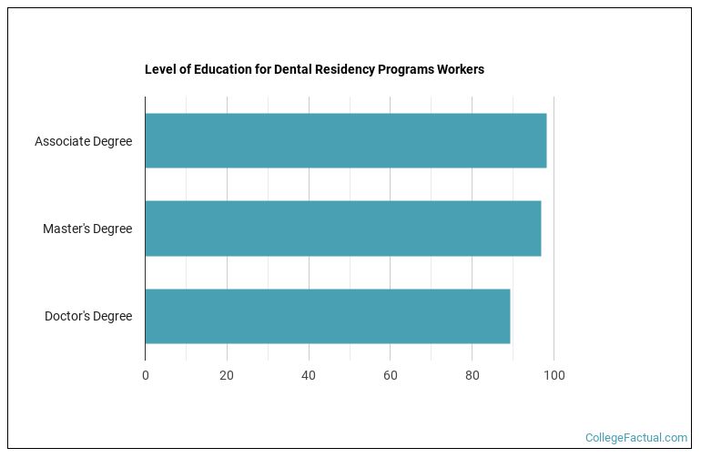 Most workers in dental residency have at least a doctor's degree. View the chart below to get an idea of what degree level most of those in dental residency programs careers have.