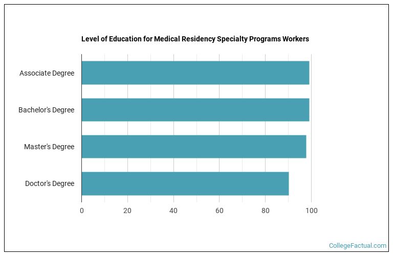 90.1% of medical residency specialty workers have at least a doctorate. View the chart below to get an idea of what degree level most of those in medical residency specialty programs careers have.